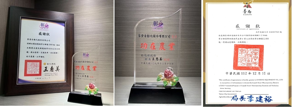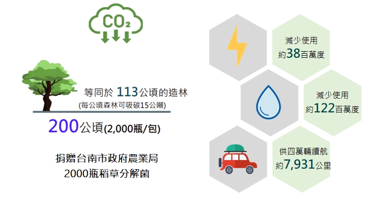 響應彰化縣政府農業處及台南市政府農業局推動使用稻草分解菌取代傳統燃燒,減少燃燒稻草造成空氣汙染,以科技節省人力及時間,且可加速稻草腐化,增加土壤有機質量讓「稻草還田」循環農業資源再利用。