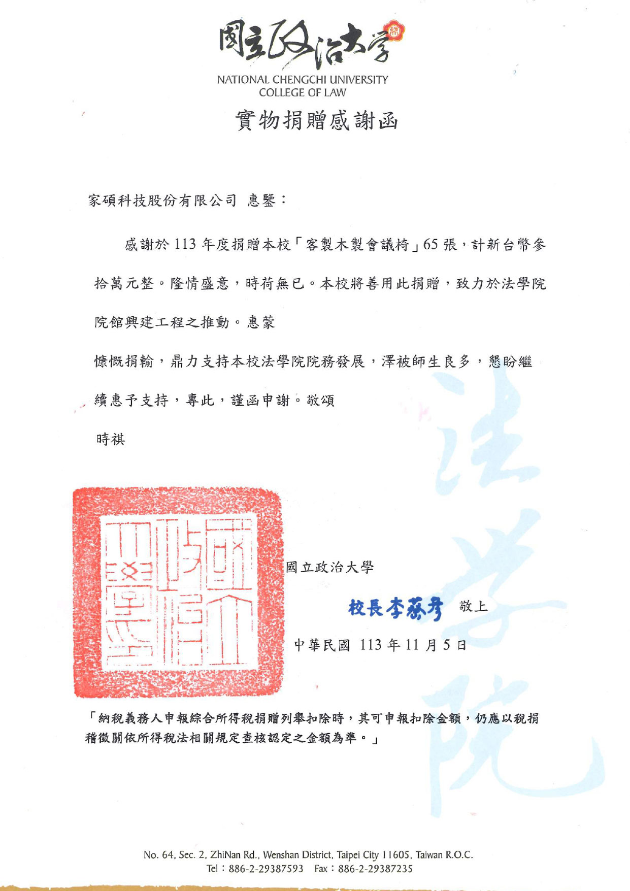 捐贈政大教學設施 共建優質學習環境