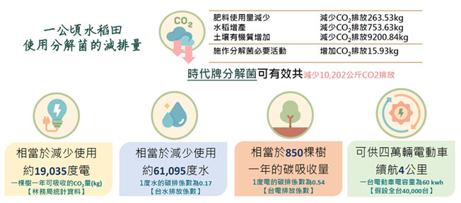 透過實際數據可見,使用稻草分解菌,不僅有效減碳,更能將廢棄稻草轉化為土壤養分,使「稻草還田」真正落實循環再利用。
