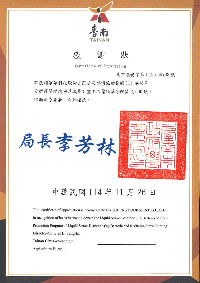 家碩科技認同稻草分解菌的環境價值,並成為地方政府在推動減碳農務上的重要夥伴。我們每年贊助 2,000 瓶稻草分解菌,累積投入金額超過 191 萬元,每年可應用於 200 公頃稻田,換算有效減少 2,040公噸二氧化碳排放量,相當於減少用電380萬度;減少用水1,221萬度;17萬棵樹一年的碳吸收量。
