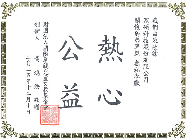 家庭,是孩子最初的避風港,但對許多單親家庭而言,這個避風港常因突發的變故而動搖。家碩科技自2023年起,每月固定捐款予國際單親兒童文教基金會,讓單親家庭在面臨突發變故時獲得幫助,避免生活崩解,陷入貧困循環。