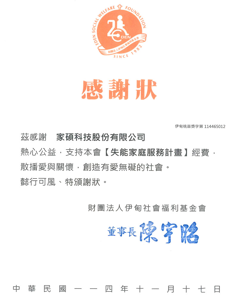 社會中仍有許多人在困境中努力前行,伊甸基金會長期為身心障礙者及弱勢家庭爭取權益、提供全人關懷。家碩科技自2021年起,每月固定捐款予伊甸基金會,由伊甸統籌,用於弱勢兒童、弱勢社區、老人服務、成人身障、失能家庭等多項援助,盼讓幫助被靈活地送達最需要的角落。