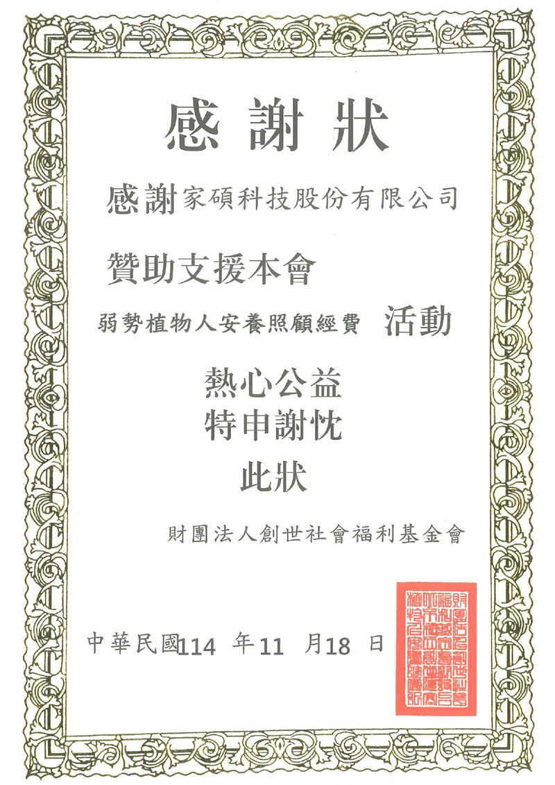 我們關注重度臥床者及植物人的照護議題,安養照護需要持續的資源,自2023年起,家碩科技每月固定捐款予創世基金會,讓專業團隊能專注於照護工作。