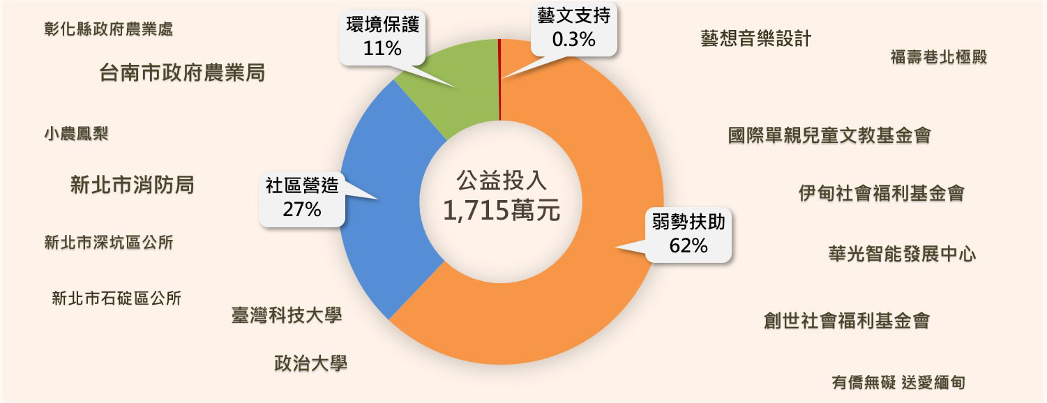 「回饋社會,創造共好」,家碩科技致力於以穩健而有效的方式推動社會發展,積極投身於弱勢扶助、社區營造、環境保護、藝文支持等四大公益領域,並以具體行動回應社會需求。截至2024年,本公司社會公益投入歷年累計約1,715萬元。